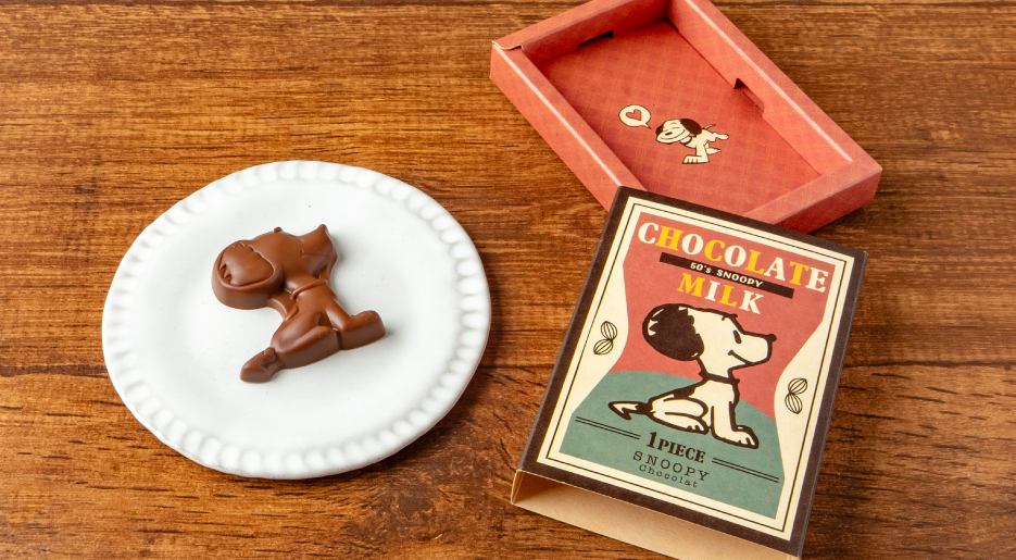 にっこり笑顔が可愛い、50年代デザインのスヌーピー型チョコレート。 ミルクチョコレートのやさしい味わいが広がります。 レトロな質感がおしゃれなパッケージにも注目です。 ※外装箱は牛乳パックなどの古紙を再利用した「ぽらむ」という紙を使用しております。斑点や模様等は素材特有の風合いです。